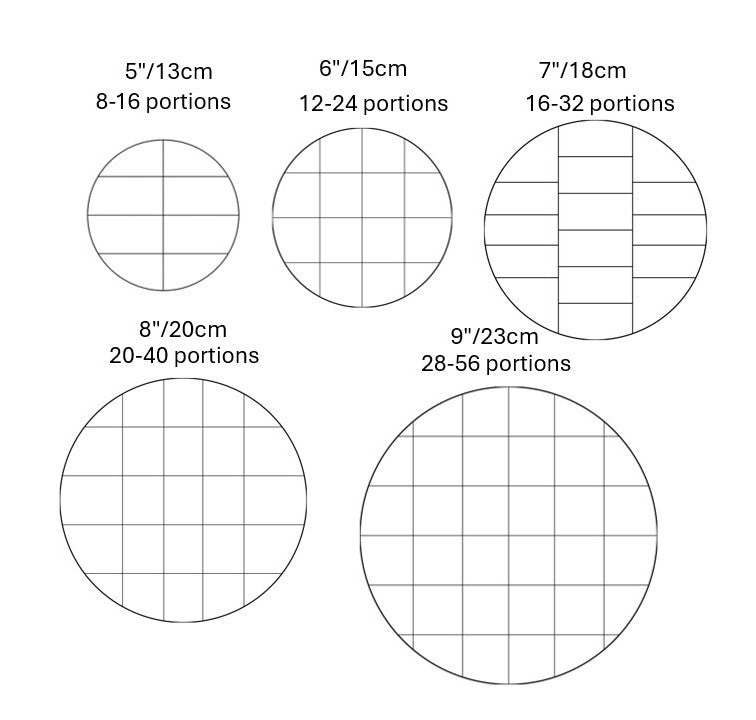 My standard cakes have four-layers of sponge inside. The smaller of these two numbers assumes a full 'dessert portion', where each slice is the full height of the cake. Expect a full tummy!