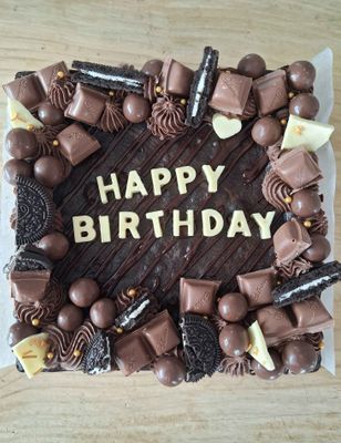 A chunky 8" slab of the richest chocolate brownies, studded with your choice of extra yummies (or just go classic if you wish), topped with swirls of icing, a selection of yummies choccies and an edible message of your choosing (up to 15 characters).